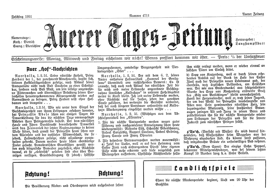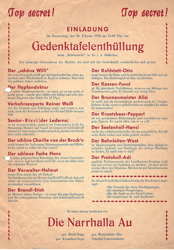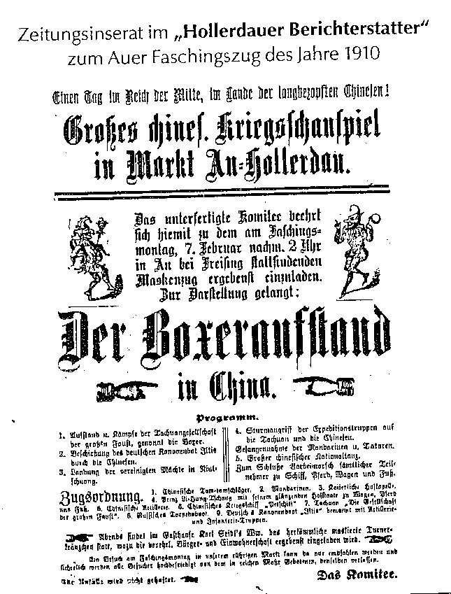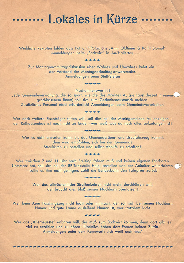 Es wurde mit 2 Bulldogs durch Au gefahren, weil keiner in die Fußstapfen von Josef Lechner, Hans Maier und Michl Maier treten wollte (damals Verkehrsverein)