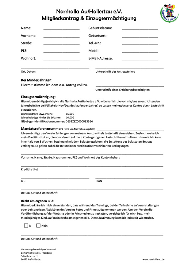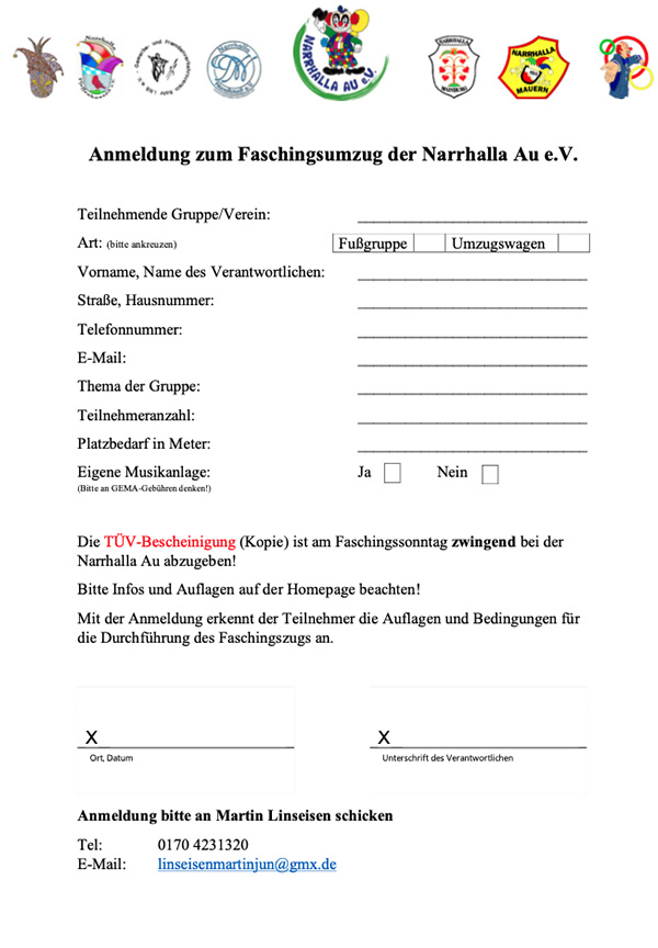 Hier findet ihr alle wichtigen Formulare der Narrhalla Au – übersichtlich zusammengestellt und direkt zum Download. Egal ob Mitgliedsantrag, Sponsoring oder Anmeldung: alles Wichtige auf einen Klick.